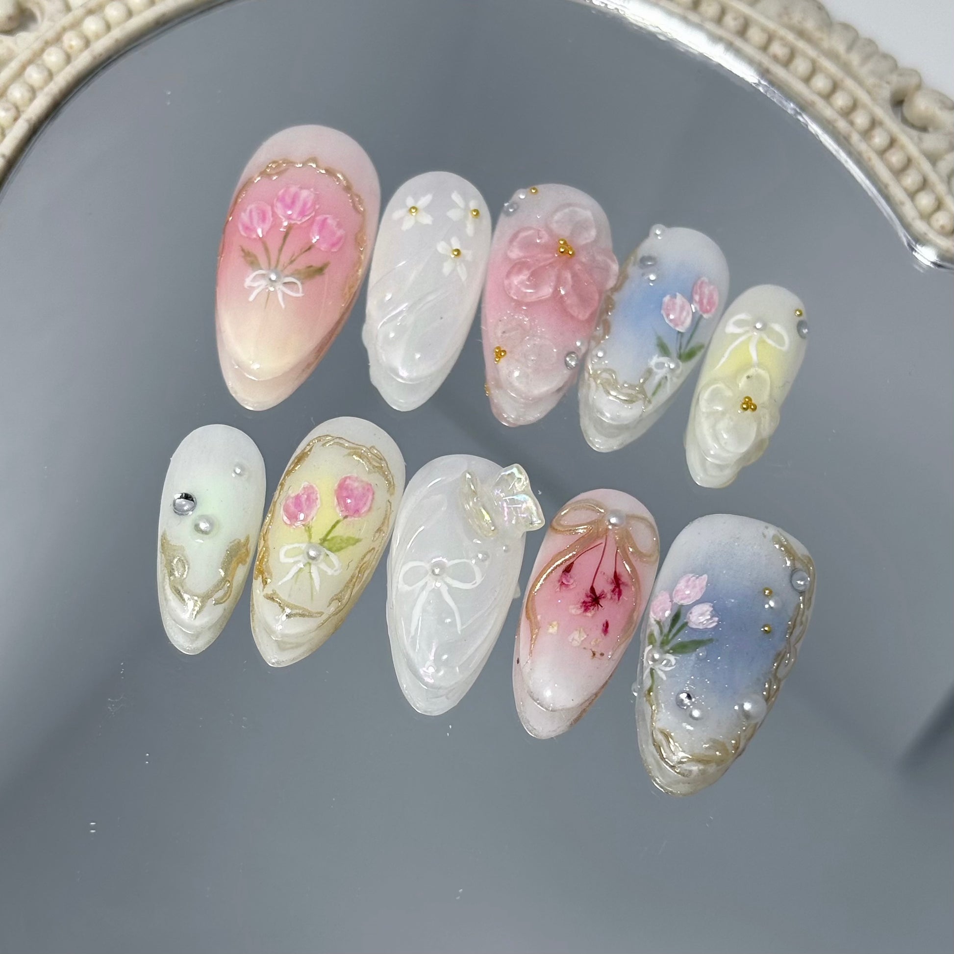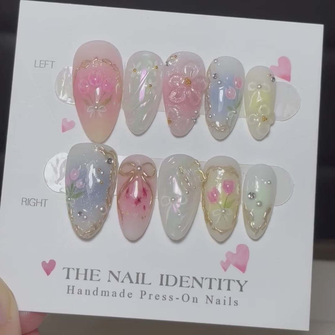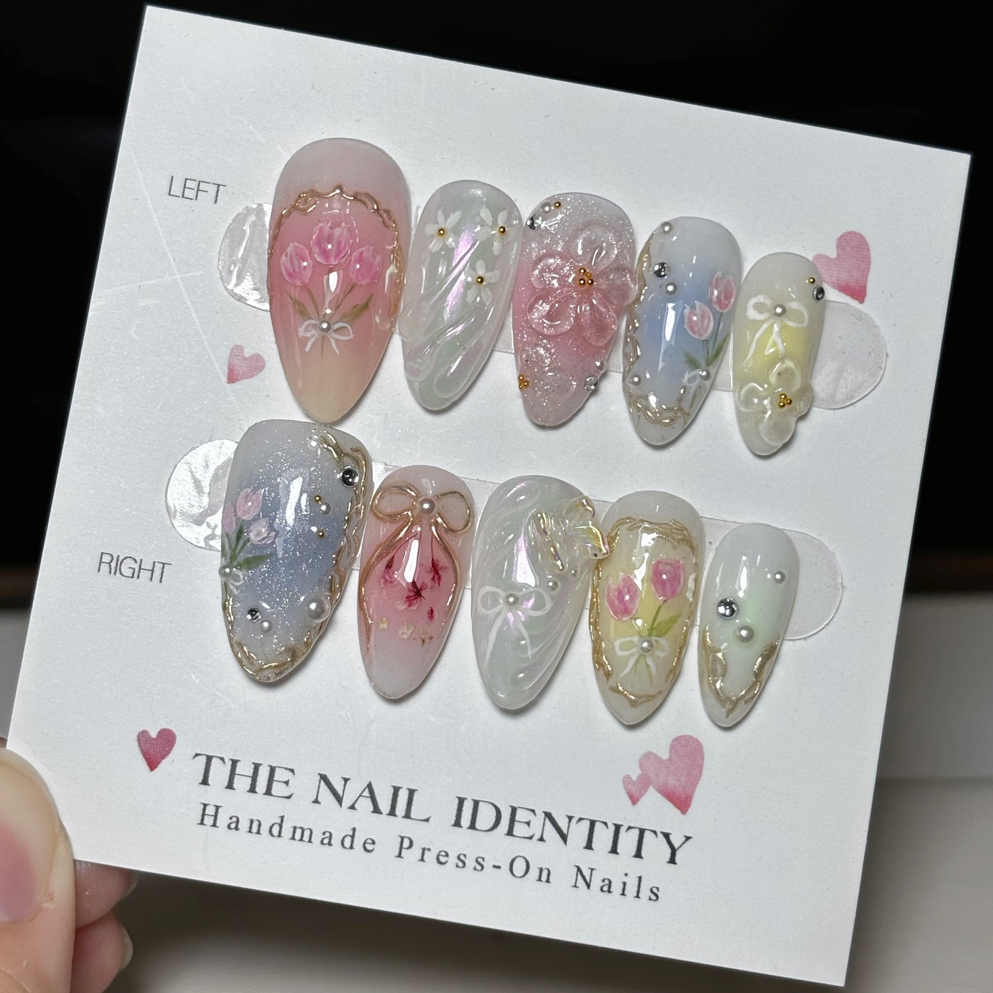 1 set of nails, Mini file, Mini buffer, Cuticle pusher, 2 alcohol wipes, 24 adhesive tabs