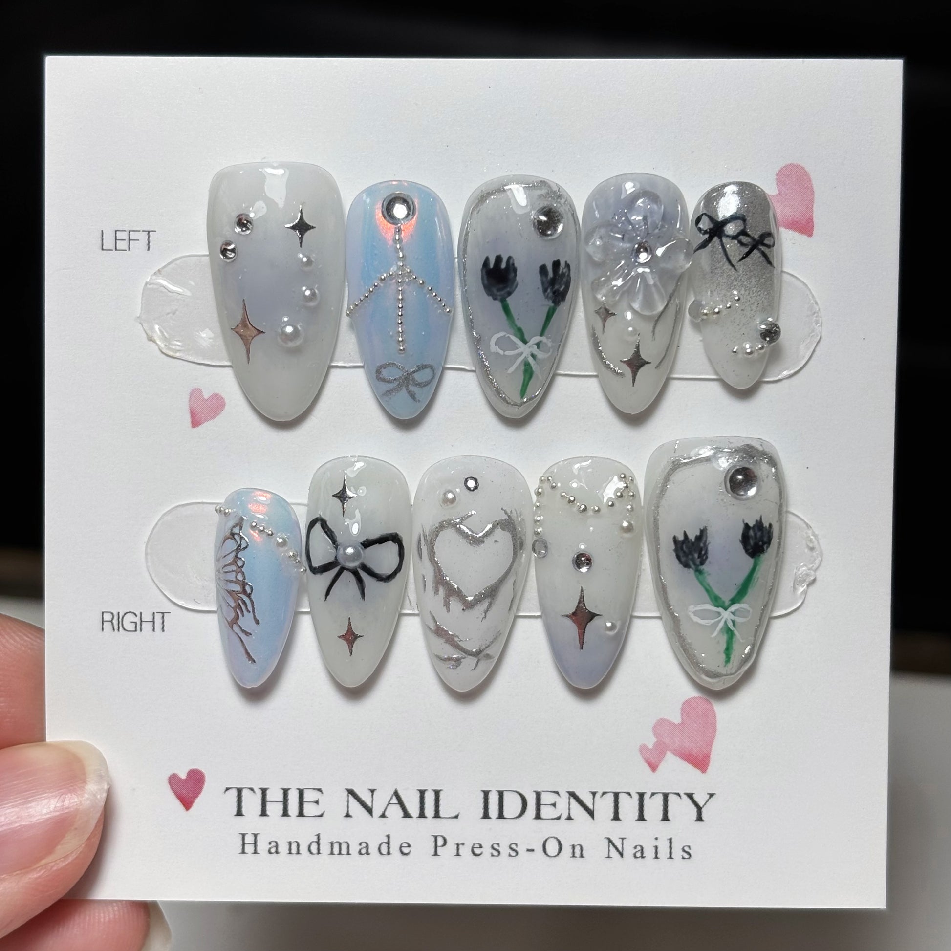 1 set of nails, Mini file, Mini buffer, Cuticle pusher, 2 alcohol wipes, 24 adhesive tabs