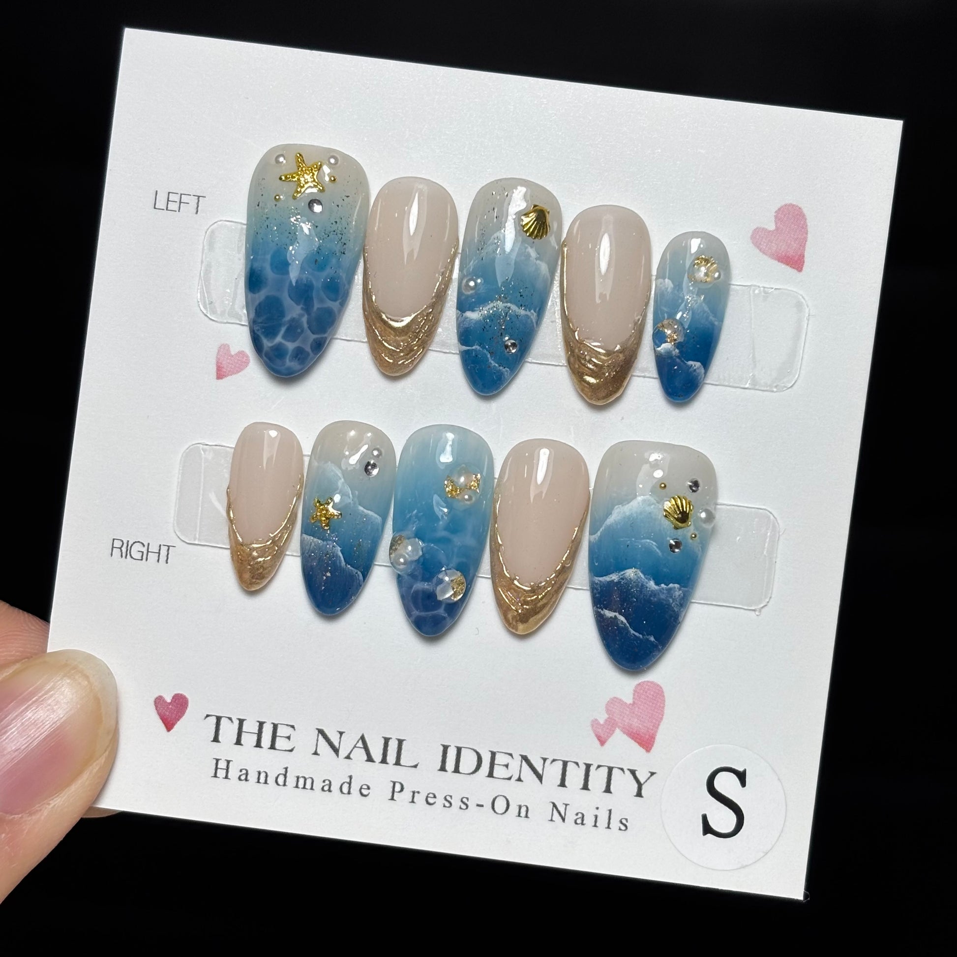 1 set of nails, Mini file, Mini buffer, Cuticle pusher, 2 alcohol wipes, 24 adhesive tabs